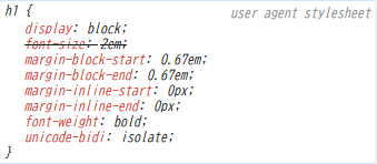 上のh1タグのUAスタイルシートを見てみると、display: block;が入っています。