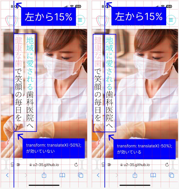 前回はleftが悪いのかな?iOSは計算がちょっと違うのかな?とごり押しで%の数値を変えて対応していたのですが、ページ更新で変わってしまうあたりそうではなさそうです。