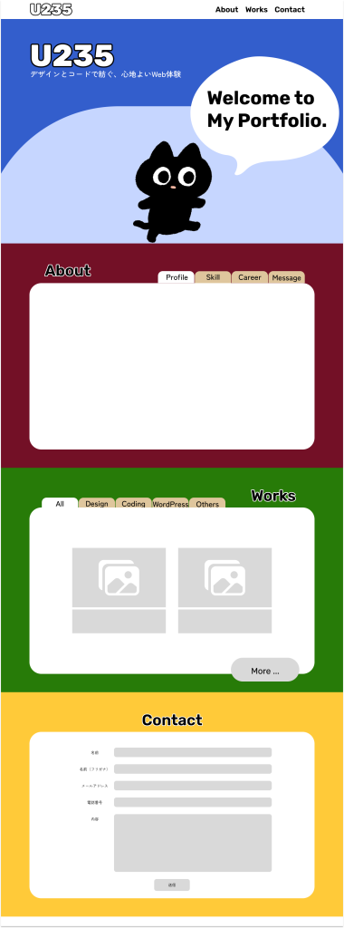 トップページの構造を解説すると、各セクション(メインビジュアル、About、Works、Contact)を100vhごとに分けて、セクションの中身(プロフィール、スキル、経歴、メッセージ)はタブで切り替える感じにしました。